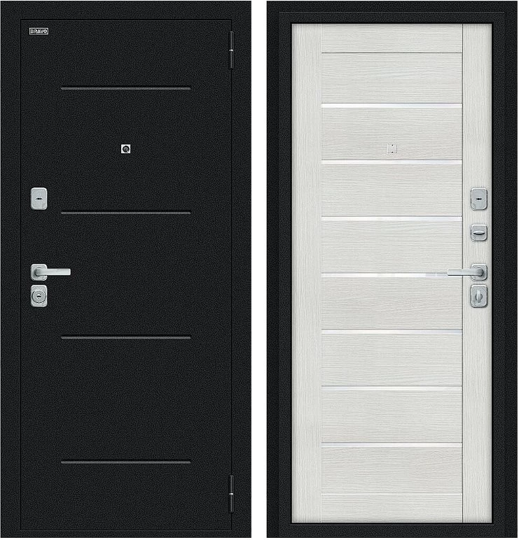 Надежная входная Дверь Браво Техно/BChrome Букле черное/Bianco Melinga премиум класса по цене 34 435 руб. Большая толщина стали защитит от проникновения в ваш дом, квартиру или коттедж. Используется очень качественная фурнитура: замки, цилиндры, ручки, защелки. Покрытие и отделка двери изготовлено под внимательным контролем производителя. Дверь имеет долгий срок службы и гарантию.